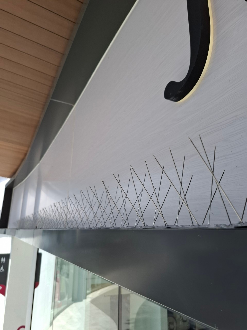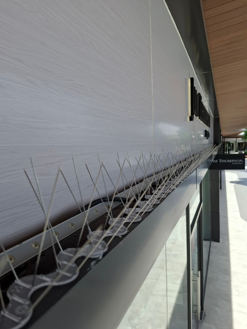 ผลงานติดตั้งครั้งนี้ดำเนินการบริเวณขอบป้ายหน้าร้านที่ยื่นออกมาจากตัวอาคาร ซึ่งเป็นจุดที่นกสามารถเกาะได้ง่าย ทีมงานติดตั้งหนามกันนกตลอดแนวขอบโครงสร้าง เพื่อป้องกันการเกาะพักของนกและลดปัญหาคราบมูลนกบริเวณหน้าร้าน