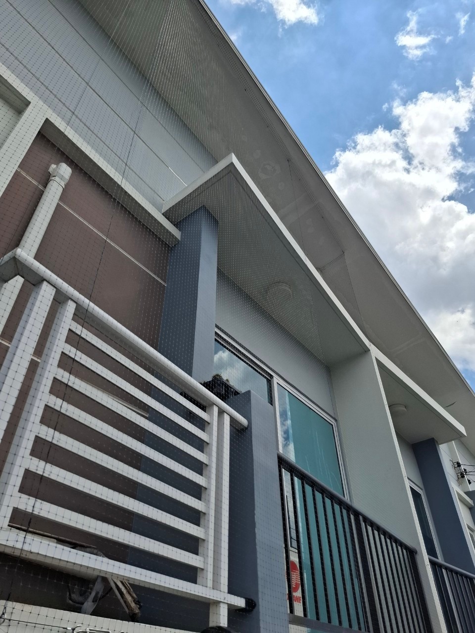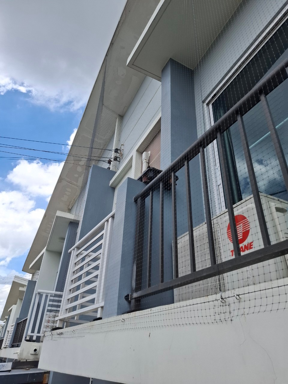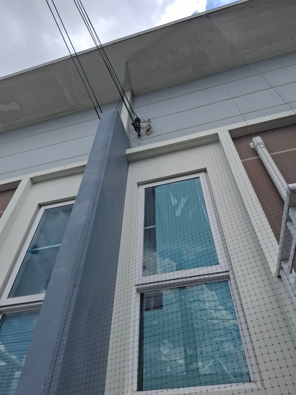 ผลงานในครั้งนี้คือการติดตั้งตาข่ายป้องกันนก (Bird Net) ครอบคลุมพื้นที่ด้านหน้าทาวน์โฮมทั้งหมด ตั้งแต่บริเวณระเบียงชั้นบน ใต้ชายคา ช่องว่างระหว่างชั้น ไปจนถึงพื้นที่ผนังด้านข้าง เพื่อปิดกั้นทุกช่องทางที่นกสามารถเข้าถึงได้อย่างสมบูรณ์