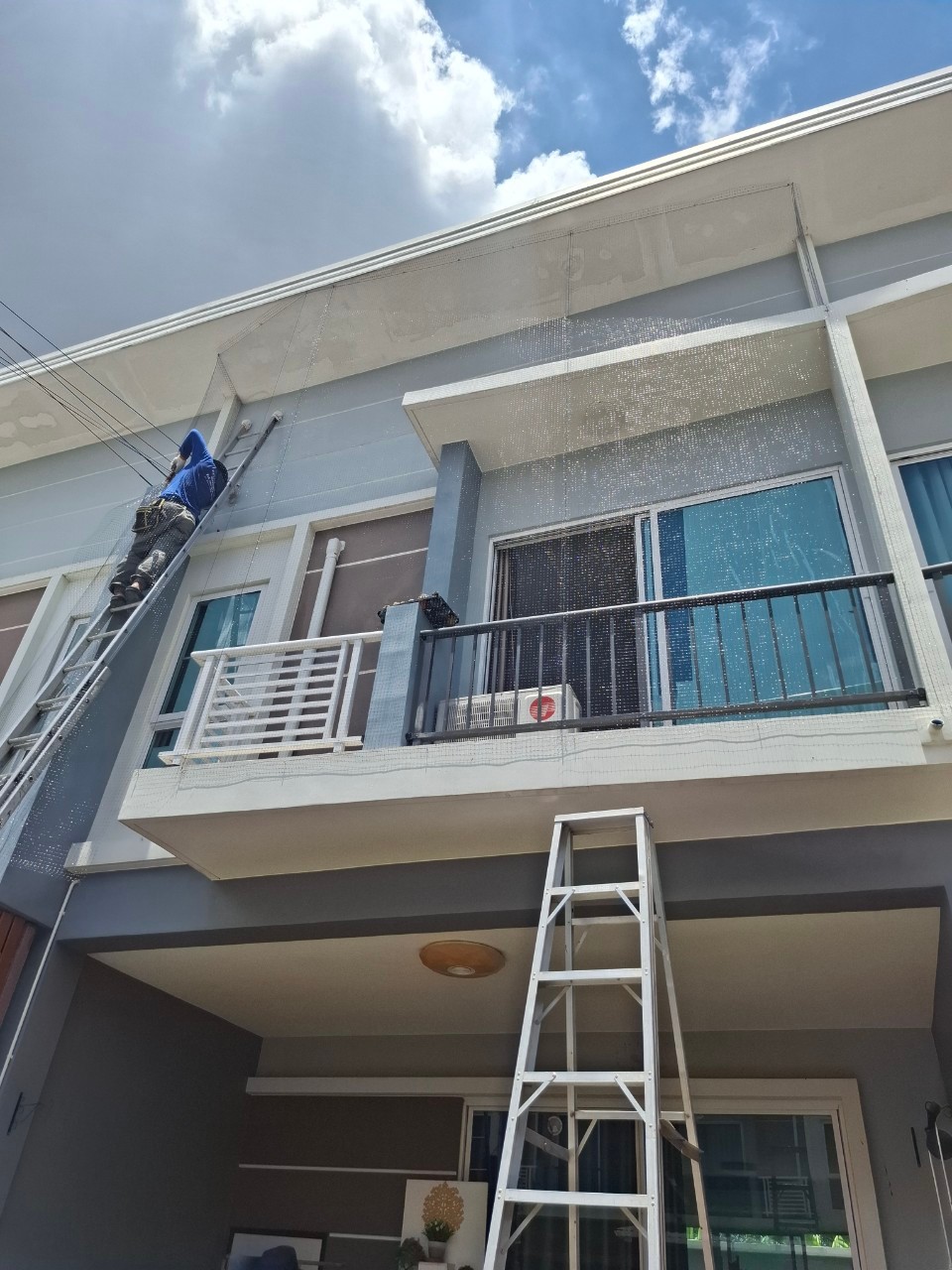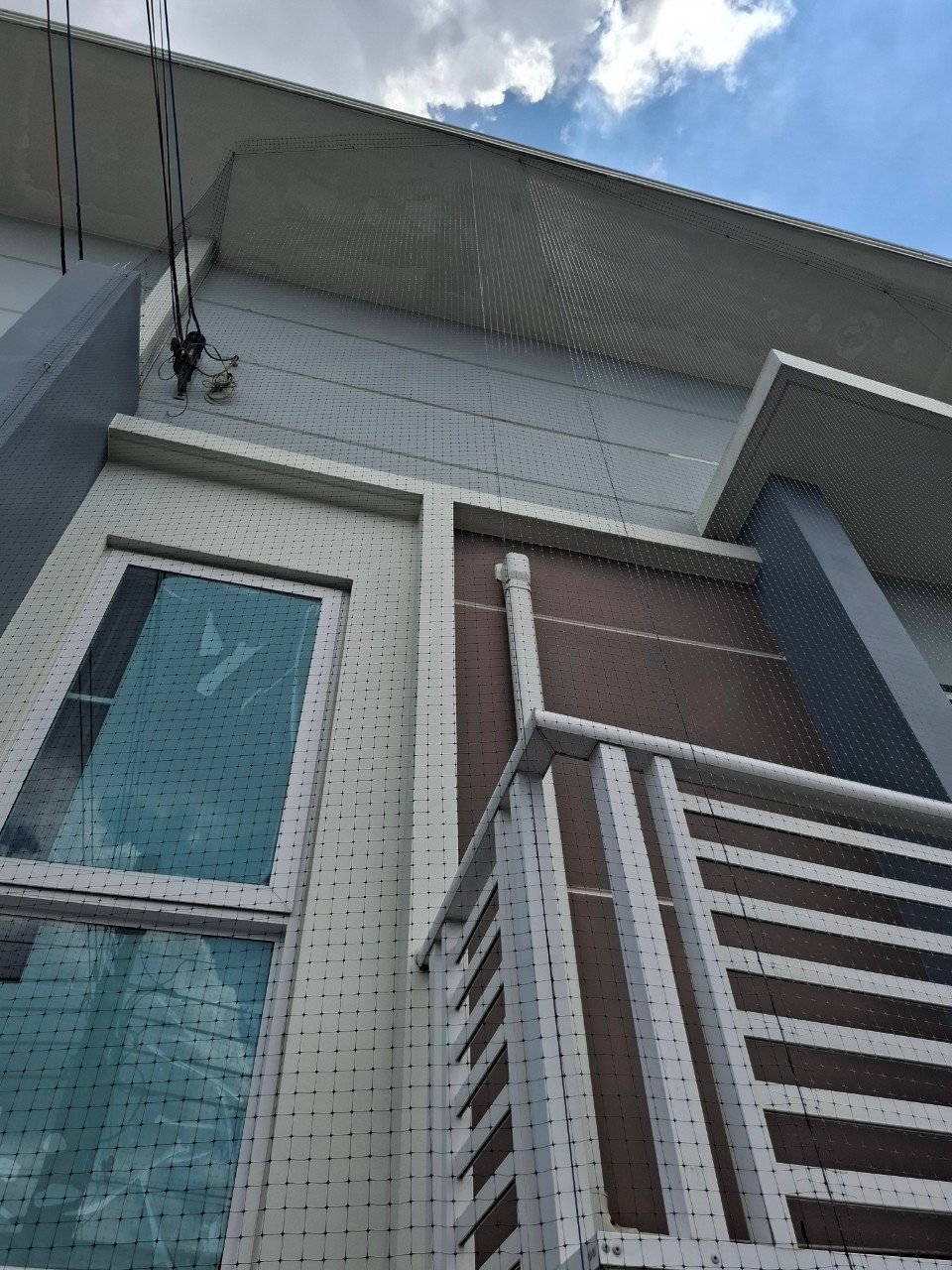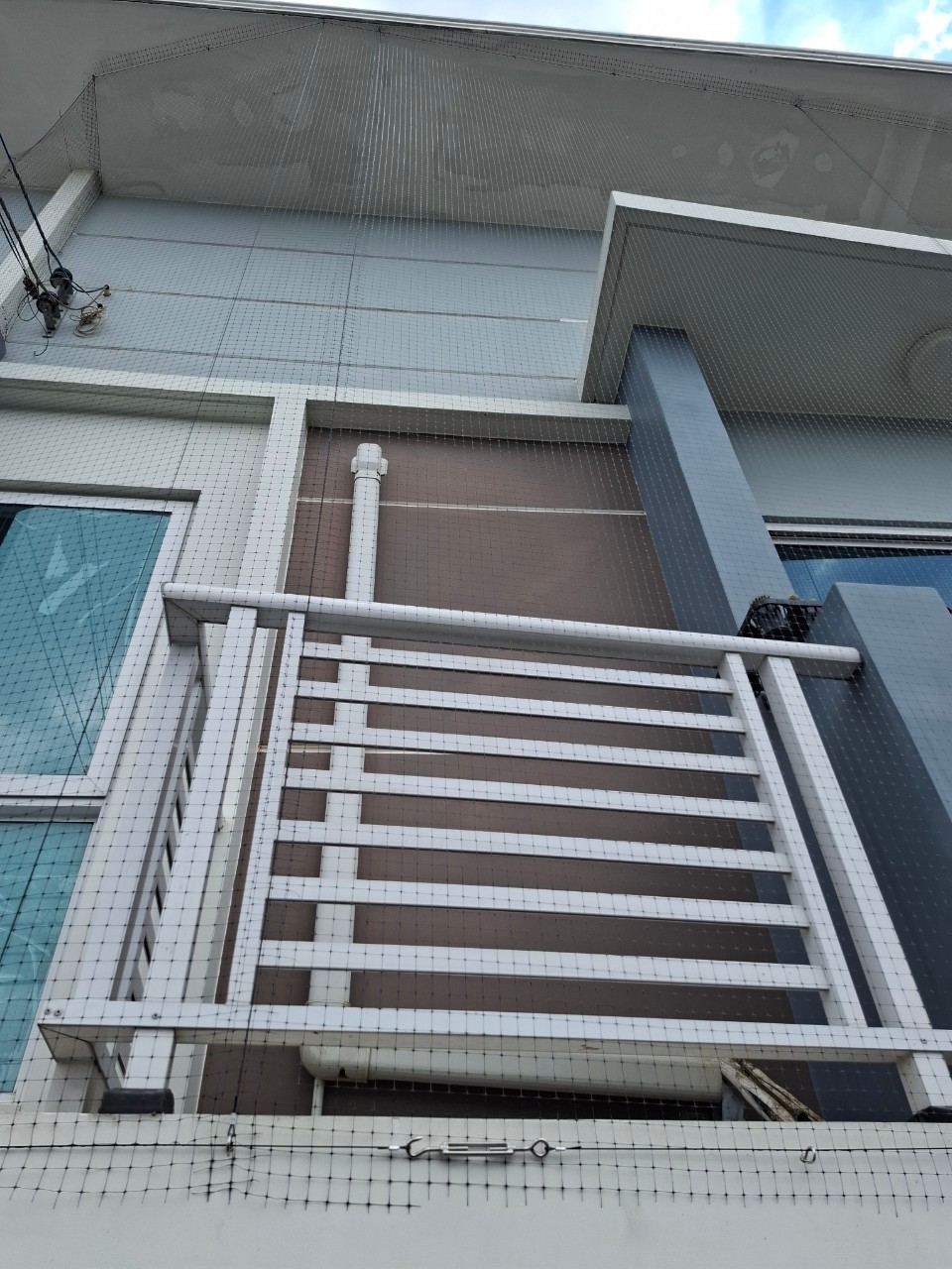 ผลงานในครั้งนี้คือการติดตั้งตาข่ายป้องกันนก (Bird Net) ครอบคลุมพื้นที่ด้านหน้าทาวน์โฮมทั้งหมด ตั้งแต่บริเวณระเบียงชั้นบน ใต้ชายคา ช่องว่างระหว่างชั้น ไปจนถึงพื้นที่ผนังด้านข้าง เพื่อปิดกั้นทุกช่องทางที่นกสามารถเข้าถึงได้อย่างสมบูรณ์