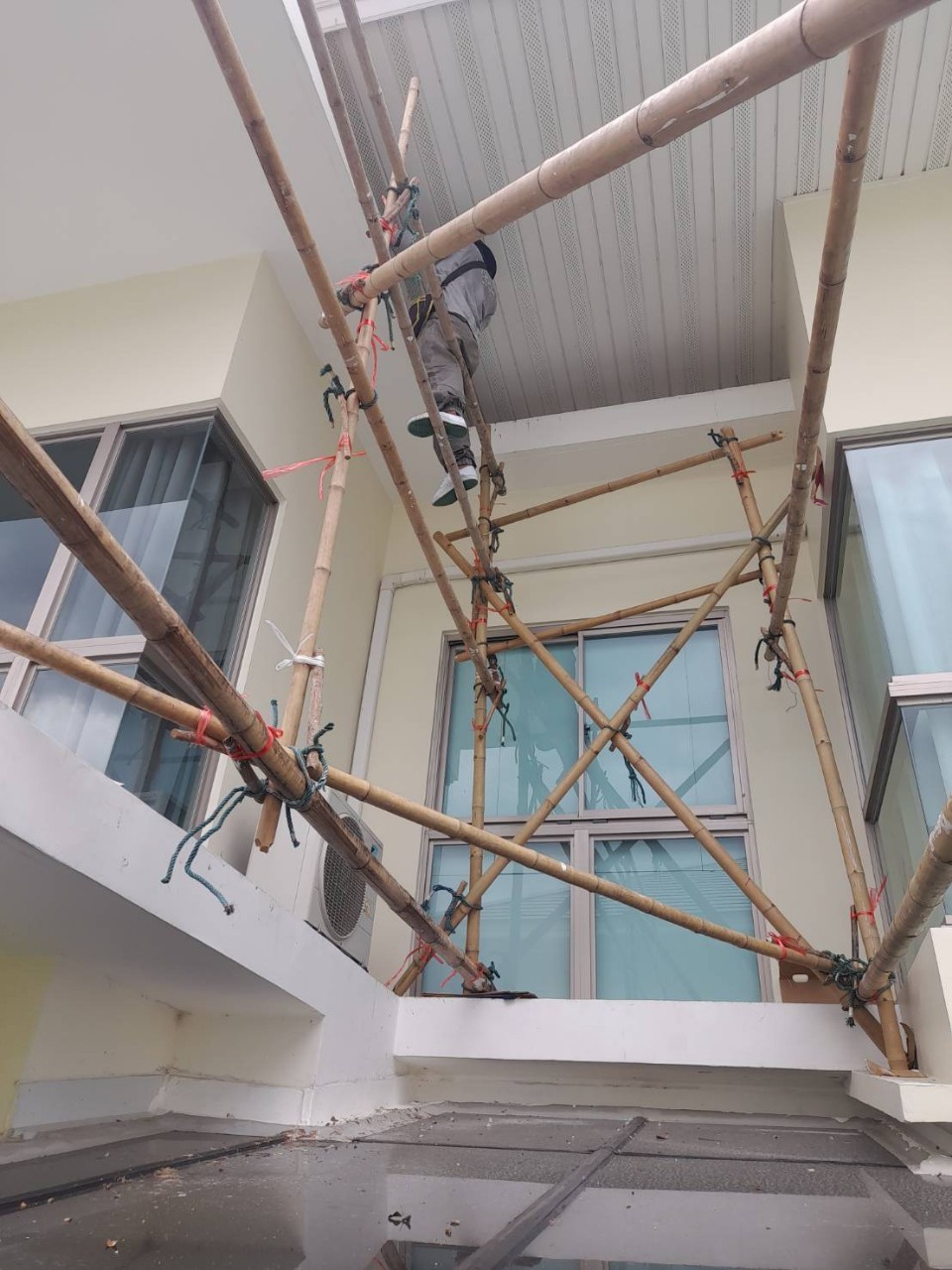 ทีมมีทรัพย์ 888 เข้าดำเนินการติดตั้ง ตาข่ายกันนกพิราบ ให้กับบ้านในโครงการ Perfect Masterpiece บริเวณกรุงเทพกรีฑา-พระราม 9 โดยครอบคลุมพื้นที่หลังคาและชายคาที่นกชอบมาใช้จอดพัก ทีมงานใช้นั่งร้านไม้ไผ่สำหรับงานที่สูงเกินระดับบันได เพื่อให้การติดตั้งแม่นยำและแน่นหนาตลอดแนว